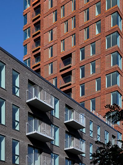 Both the block and tower are finished in reddish and dark shades of brick, which blend simply and clearly with the Carlsberg Citys palette of building materials and colours. The development is divided into small townhouses with clear façade changes, which create variation and build on the tradition of the Carlsberg Citys craftsmanship, with fine details in patterned brickwork.