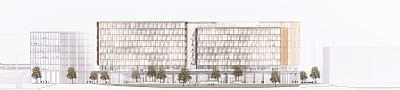 Towards Lohse Park outdoor spaces with a close connection to the park are being established on the roof of the base, between the flowing landscape and the office strip green courtyards are being created, and on the roof of the office strip overlooking the park a roof garden is being established with a view of the park and the city of Hamburg.
