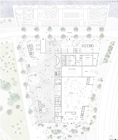 The design comprises an urban base, a strip of office areas, a unifying flowing landscape and several green roof gardens and courtyards. The base accommodates the outward-looking, publicly oriented functions that ensure an active front with respect to the city, whilst drawing urban life into the building in the form of food outlets, cafés, an art gallery, Gruner + Jahr’s canteen, a conference centre etc. The office areas above the base are made up of flexible, manageable sections that are visible from both inside and outside; they are further subdivided by ‘soft spots’ featuring informal meeting places, vertical links between the storeys and great openness towards the city.