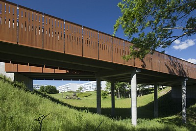 The new traffic layout, which is designed primarily to accommodate public transport services, cyclists and pedestrians, features a new and outstanding combined road and footbridge, clad with COR-TEN™ steel, which spans a natural gorge in the terrain. A central feature in Varbergparken is The Activity Park, where materials and installations of different kinds invite people to engage in physical activities at many different levels, depending on their age and physical adroitness.