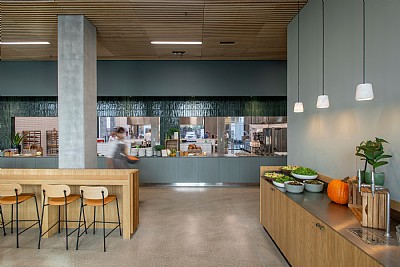 The interior palette focuses on the tactility of materials — wood, metal, stained surfaces, recycled plastic, and a variety of textiles — to achieve both warmth and contrast. The result is an environment that is both durable and sensuous, promoting everyday well-being and a sense of belonging.