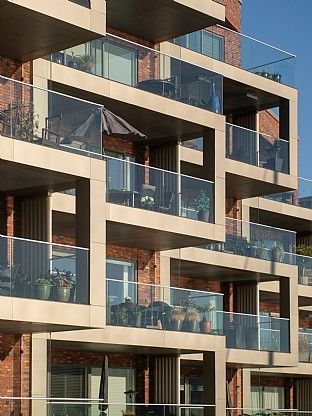 The choice of materials has been made based on quality and longevity – and how they adapt to the surroundings. A brick façade in shades of red interacts beautifully with the majestic expression of the area's barracks buildings, while the facade with windows along the strait connects to the recreational waterfront. The building's stepped form with simple offsets creates lightness and variety, while ensuring that all apartments are lit with daylight and have unique views. The offsets and terraced structure also create space for balconies clad in golden-toned aluminium facing the strait. On the upper floors, the apartments have their own roof terraces with orangeries.