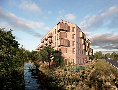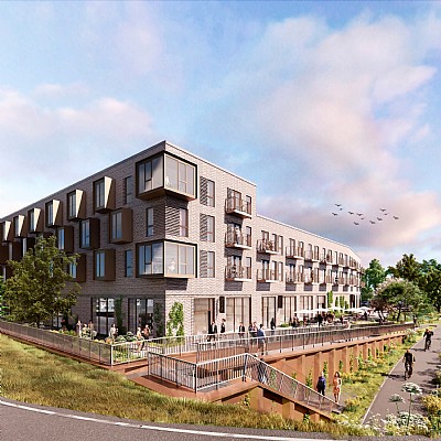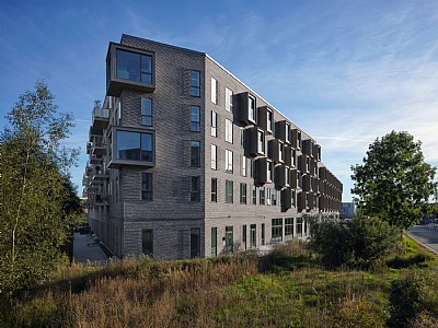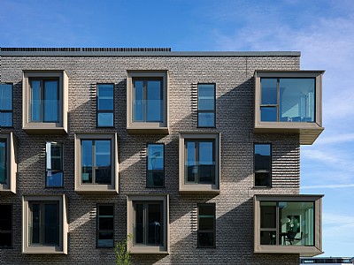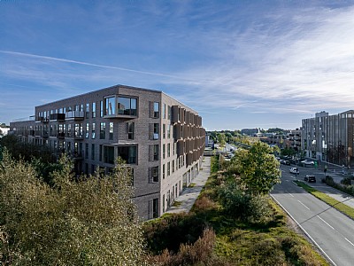 The development is a perimeter block featuring 107 apartments of varying sizes to ensure a diverse residential composition, along with three commercial units and two levels of parking on the ground floor, including a mezzanine deck. The block is articulated through height variations and subdivided volumes, visually breaking down the scale of the large building mass. The façade features patterned brickwork, bay windows, and balconies, which together create variety and unity. The ground floor has a higher ceiling to accommodate functions such as retail spaces, courtyard entrances, and bicycle parking. Private threshold zones along the façades offer residents a degree of privacy, while the street façade features an active urban edge forming part of a new retail thoroughfare connecting to the city centre.