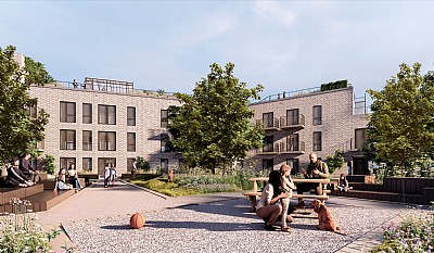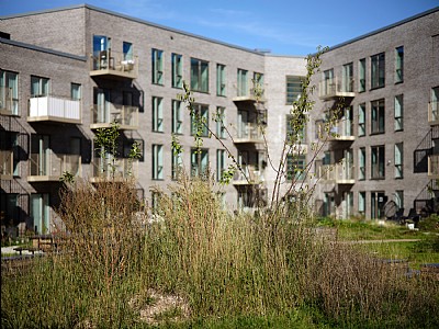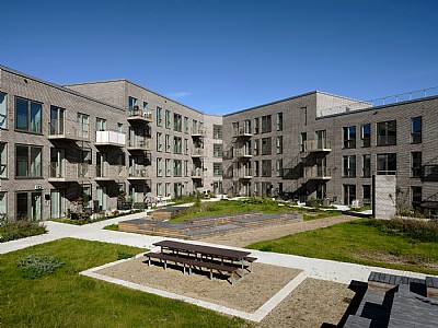 Materials are simple and durable. The red-brown brick façades and colour tones reflect Hillerød’s historic building tradition. The bay windows stand out with brown hues, while the base is darker. Paving in the courtyard corresponds to the brick tones of the façades.