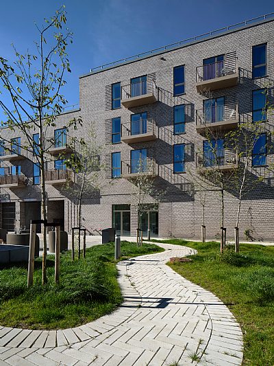 The courtyard above the ground floor parking encourages a variety of communal activities and play — from sandpits to seating platforms and sensory areas gardens. Residents also have access to two large rooftop terraces and surrounding landscaped areas. The courtyard is divided into four islands connected by a winding path network, providing benches and play equipment and creating a calm and semi-private atmosphere around the terraces.