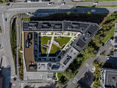 Rainwater is collected from the green roofs, and the building is DGNB Gold certified.