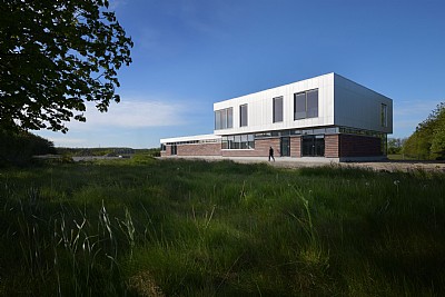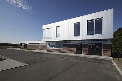 The staff building has two primary entrances, a dirty and a clean entrance. The dirty entrance contains a dirty clothes cloakroom, a dirty changing room for the bathroom, sauna and a clean changing room. Thus one gradually becomes cleaner as one moves through the building towards the foyer at the clean main entrance. The clean entrance contains the administrative section with offices, meeting rooms, an auditorium and lunch room. A laboratory will be added to the new staff building, which thus brings together all the purification plant's workplaces in one building. The two parts of the building are connected by a foyer, as the unifying arrival room, and the operations manager's office, from which there is direct access, and visual contact with the other parts of the building. Its position also allows for easy access to daily contact with the operating staff at the facility. The building is made of few, robust materials, which create coherence with the existing building mass and contribute to the new building appearing modern and attractive. The car park is being constructed as a large green forecourt, which helps to emphasise the building's function as the main building at the purification plant.