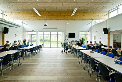 The centre for the elderly is centred on a large, high-ceilinged common room surrounded by smaller rooms: kitchen, conservatory, billiards room, computer room, toilets, store, equipment room and administration office.