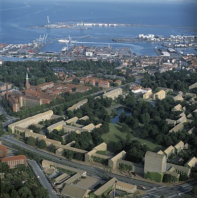 The University of Aarhus, with its extensive park in central Aarhus, includes teaching rooms, offices, libraries, workshops and student accommodation. The university has a distinct homogeneous building style and utilization of the natural contours of the landscape. The campus has emerged around a distinct moraine gorge and the buildings for the departments and faculties are placed on the slopes, from the main buildings alongside the ring road to the center of the city at Nørreport. All throughout the campus, the buildings are variations of the same clear-cut prismatic volume with pitched roofs, oriented orthogonally to form individual architectural clusters sharing the same vocabulary. The way the buildings emerge from the landscape makes them seem to grow from it, rather than being superimposed on the site.