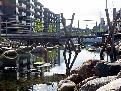 The rock garden is a place to play and explore, which also creates a link between dry land and water. The garden is designed as a free composition of rocks and stones, which is flooded by canal water. The water depth is calculated to ensure that there is always water between the stones – even at low tide.