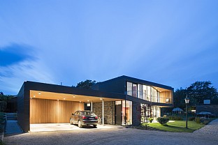 The ground floor and upper floor are designed as mirrored parallelograms, creating a vast array of open and covered terraces and niches on both levels, framed by a facade of dark patinated zinc with a warm-toned inner lining of hardwood mouldings.
