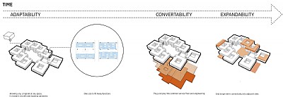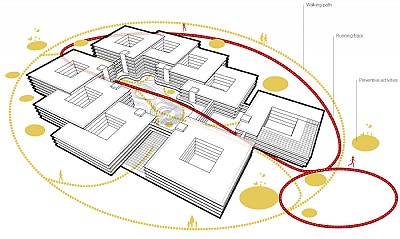 The proposal is based on the wish to create a healthcare complex that provides optimum conditions for restorative and recreational care. From an aerial view, the focus has been on creating visual interaction between the green belt to the west and the characteristically hilly landscape that extends into the site from the south. The space under the hilly landscape will be used for parking spaces in a structure that will be completed with soil fill - as the basis for an integrated green park that will also serve as a noise barrier against the surrounding roads. The green belt will extend all through the hospital, bringing light and a green aspect right into the heart of the hospital. This will also ensure welcoming and simple wayfinding, whereby various patients pass directly from the arrival area to the specific function areas.